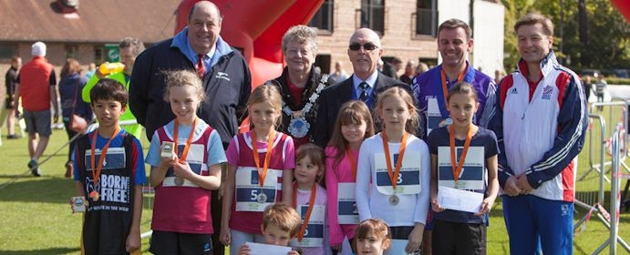 Nicholas Soames MP, Town Mayor Margaret Belsey and Richard Leman presenting the prizes at the end of the Mid Sussex Junior Mile Race during the Mid Sussex Marathon Weekend at the East Grinstead Sports Club on Saturday, 3rd May, 2014