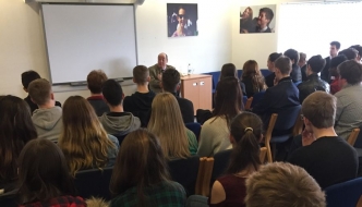 Nicholas speaks to students at St Paul's Catholic College about Sir Winston Churchill.