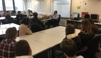 Sir Nicholas answers questions at Central Sussex College’s Political Society.