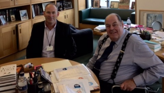 Sir Nicholas Soames congratulates defibrillator campaigner, Steve Morris.