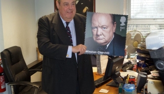 Nicholas Soames holding a newly released stamp of his grandfather, Sir Winston Churchill.