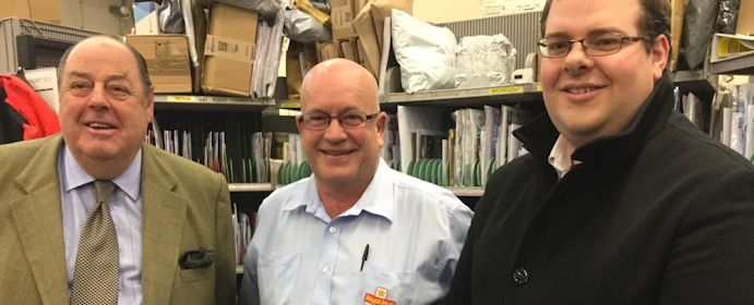 Sir Nicholas and Councillor Jonathan Ash-Edwards during a visit to Royal Mail's Haywards Heath Delivery Office. Sir Nicholas was also joined by Councillor Garry Wall, Leader of Mid Sussex District Council. Friday, 11th December, 2015.